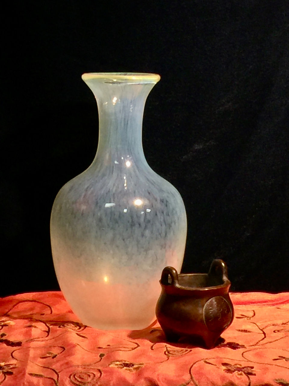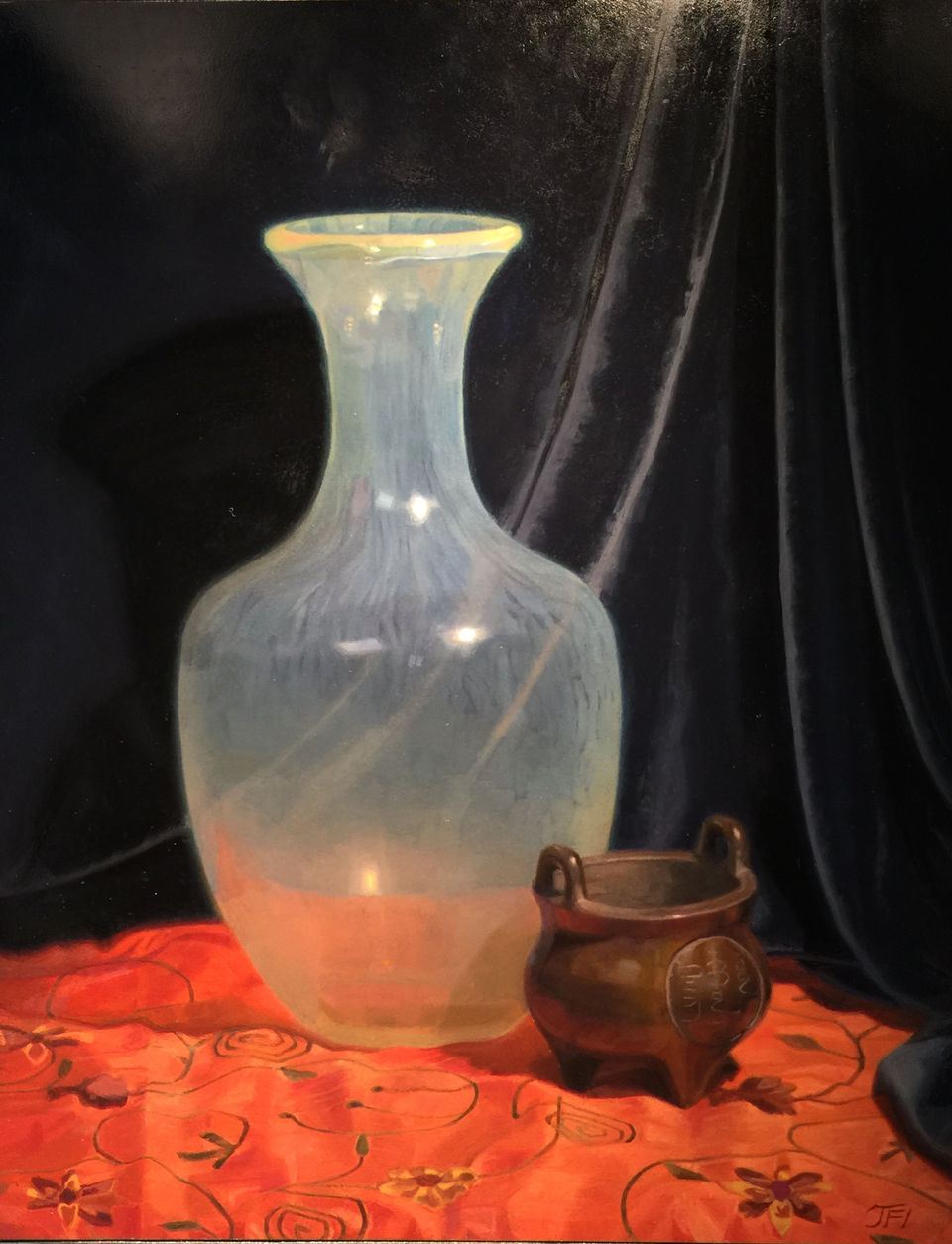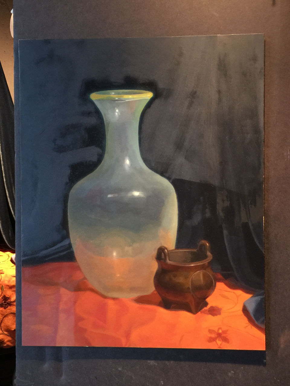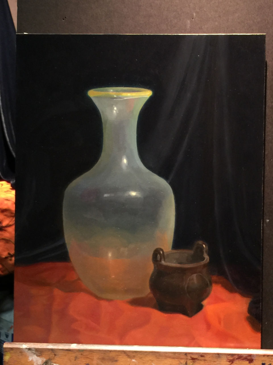 I started with the still life setup. This kind of painting is always created from life, of course. The Masters didn't have photography, so subjects - whether still lifes, portraits, history paintings or whatever, were painted from life. This is a still life so I had to choose still life objects, setup and lighting. As I have always admired the incredibly skillful treatment of materials by the Masters, I chose objects made of classic materials I wanted to try painting: glass, silk, metals and velvet. I was especially enchanted by the translucence and patterning of that hand-blown Italian vase and wanted to take on that challenge. I arranged them in a pleasing composition with interesting lighting. Then, on to the layers.