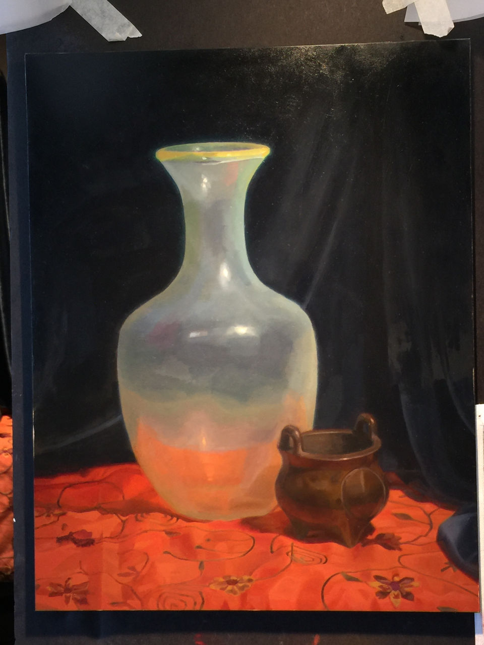 Layer seven: Glazing and highlights. Possibly my favorite layer. Glazing is painting with a thin layer of transparent pigments mixed with medium over an area of the dried painting, usually to subtly adjust the hue or temperature. For example, I glazed one side of the glass vase with a very thin layer of ultramarine blue to make it feel cooler and more in shadow. I also punched the highlights of the bronze vessel.
